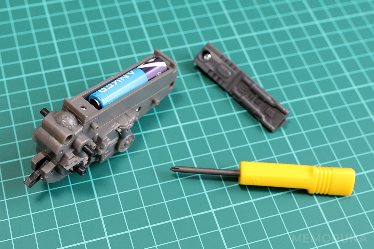 まずは動力ユニットに単4電池を装着し、動作確認を行います。ちゃんとモーターが回ればOK。
