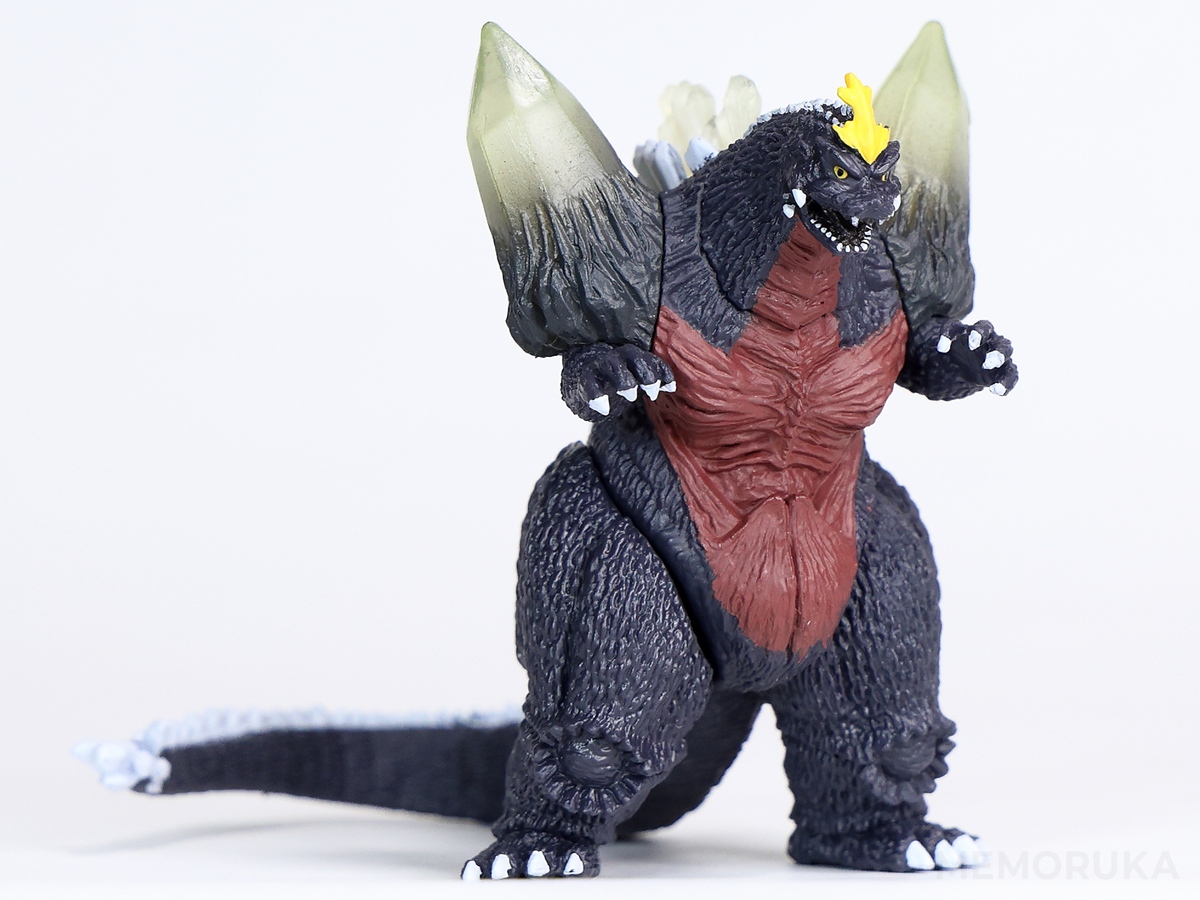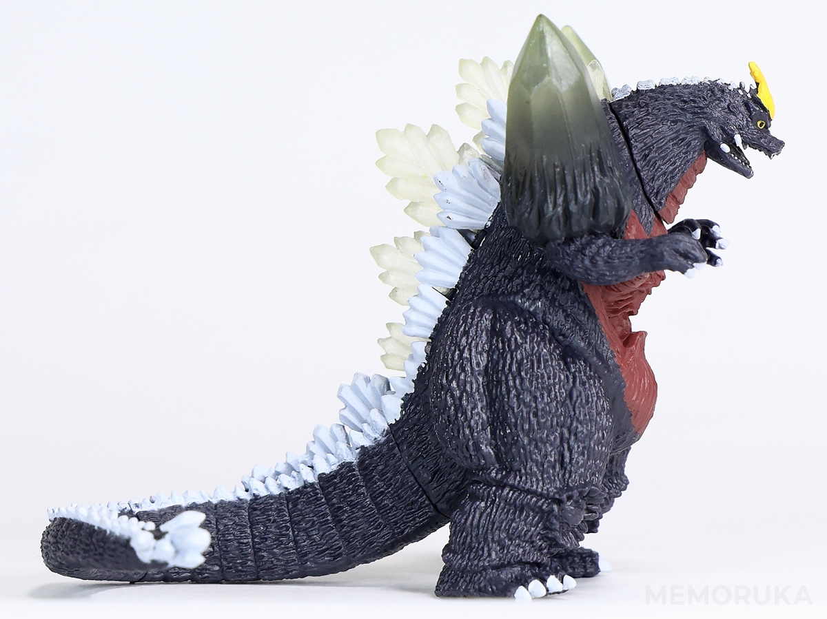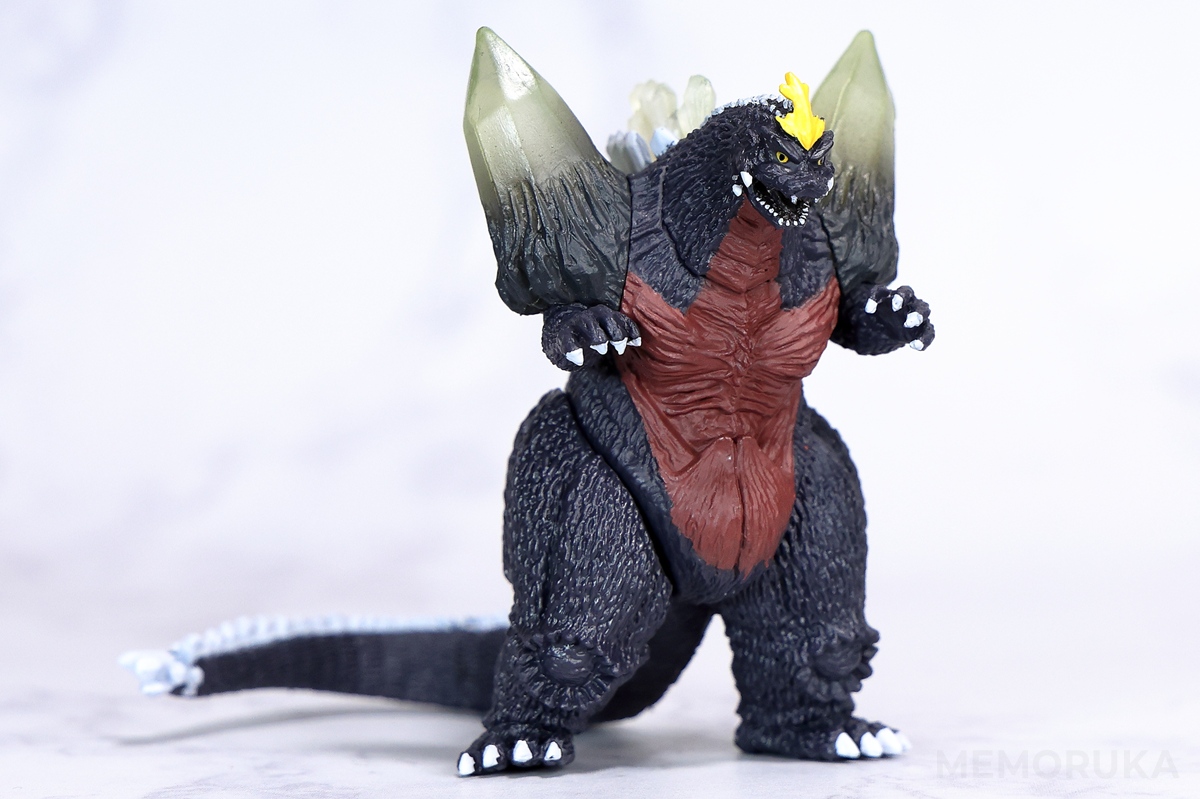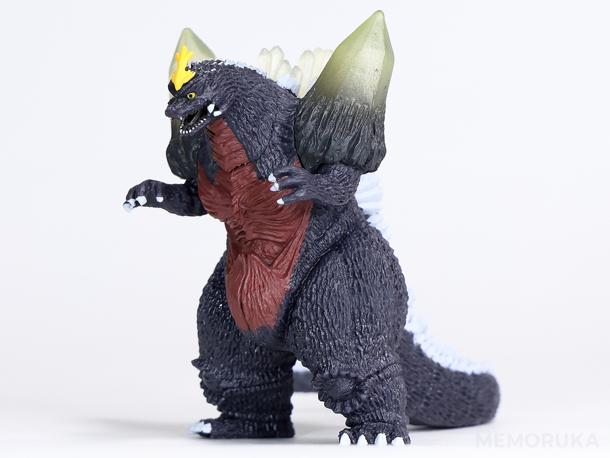 スペースゴジラは全身の結晶体や、頭部の鶏冠、突き出した牙など情報量の多い造形のため、同HGシリーズのゴジラ(1994)と比較すると、サイズ相応のデフォルメを感じられます