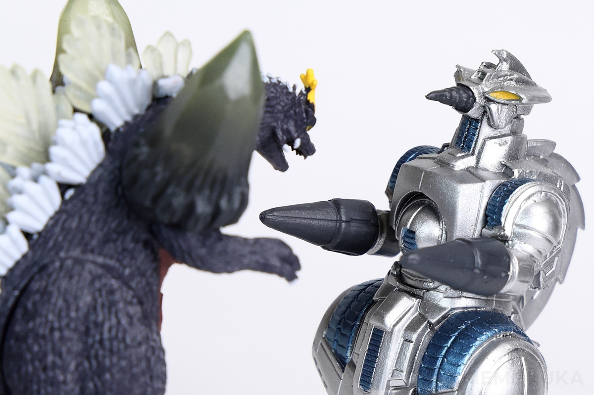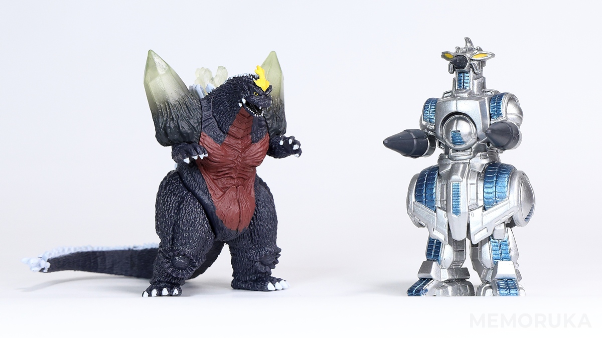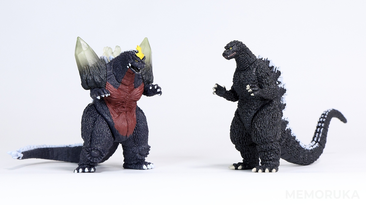 ピントの都合でスペースゴジラをやや後ろに下げている影響もありますが、並べてみるとモゲラよりも、ややひと回り小さく見える印象です。