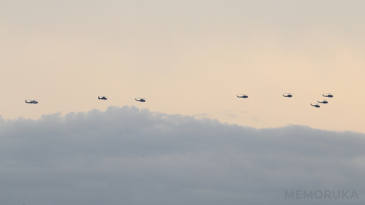ヘリコプター8機による編隊飛行。