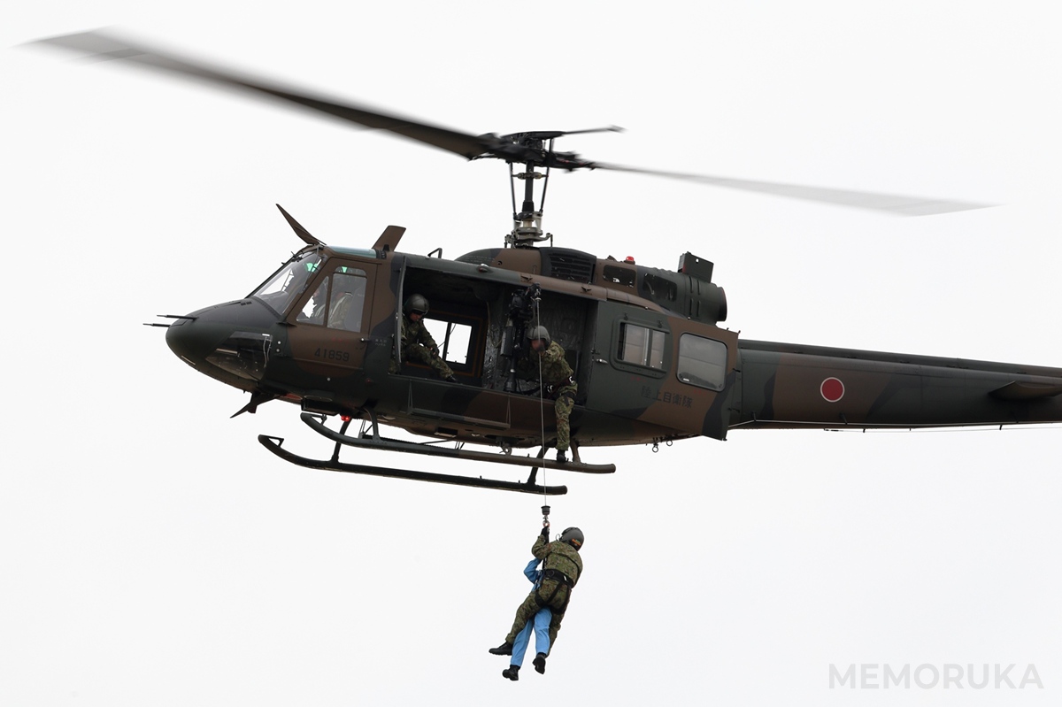 空中停止(ホバリング)した機体から、隊員がワイヤーで要救助者を引き上げる救助訓練です。