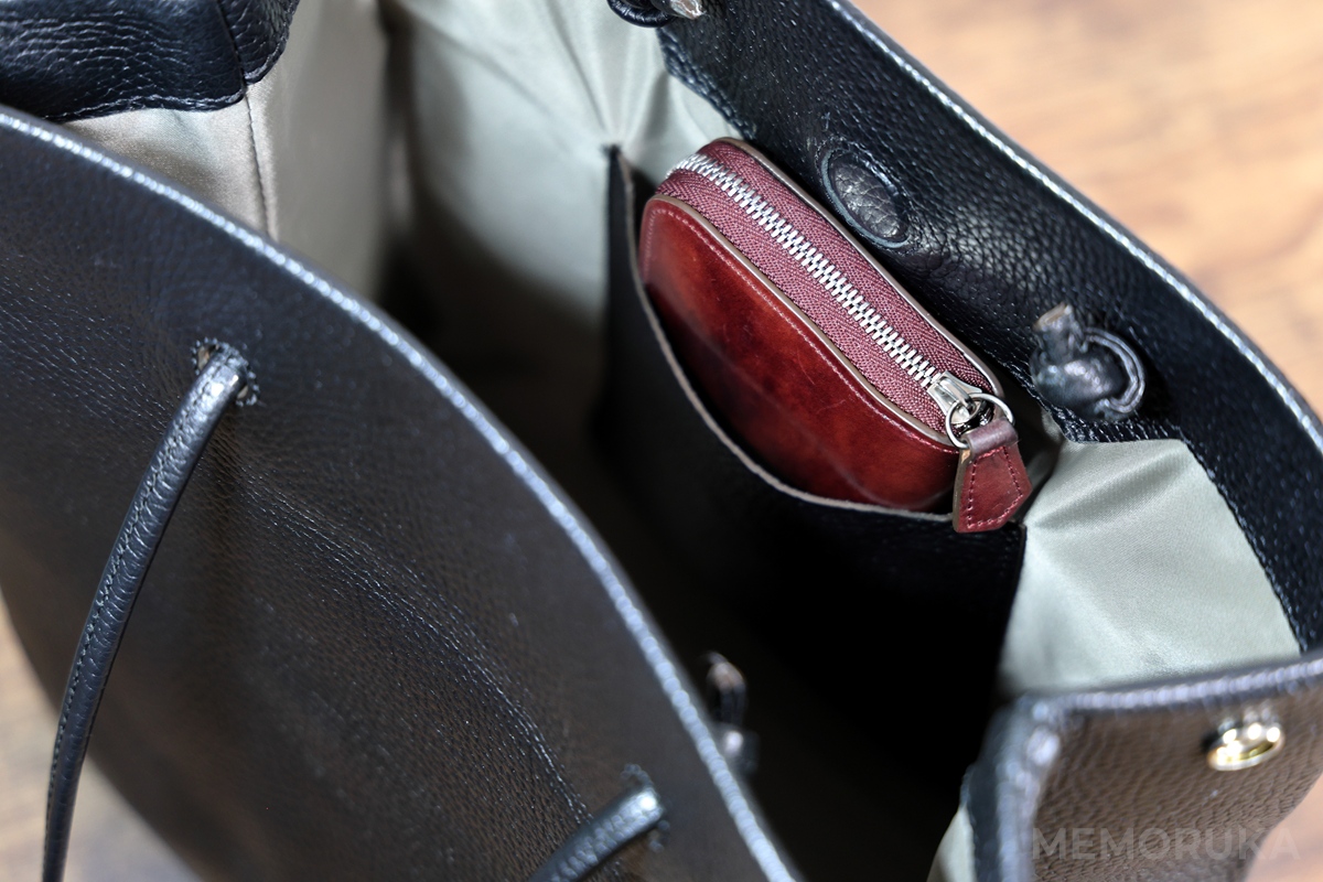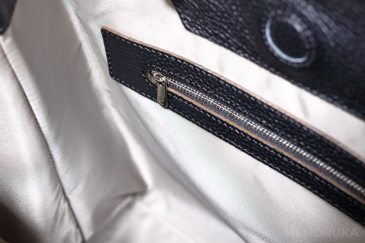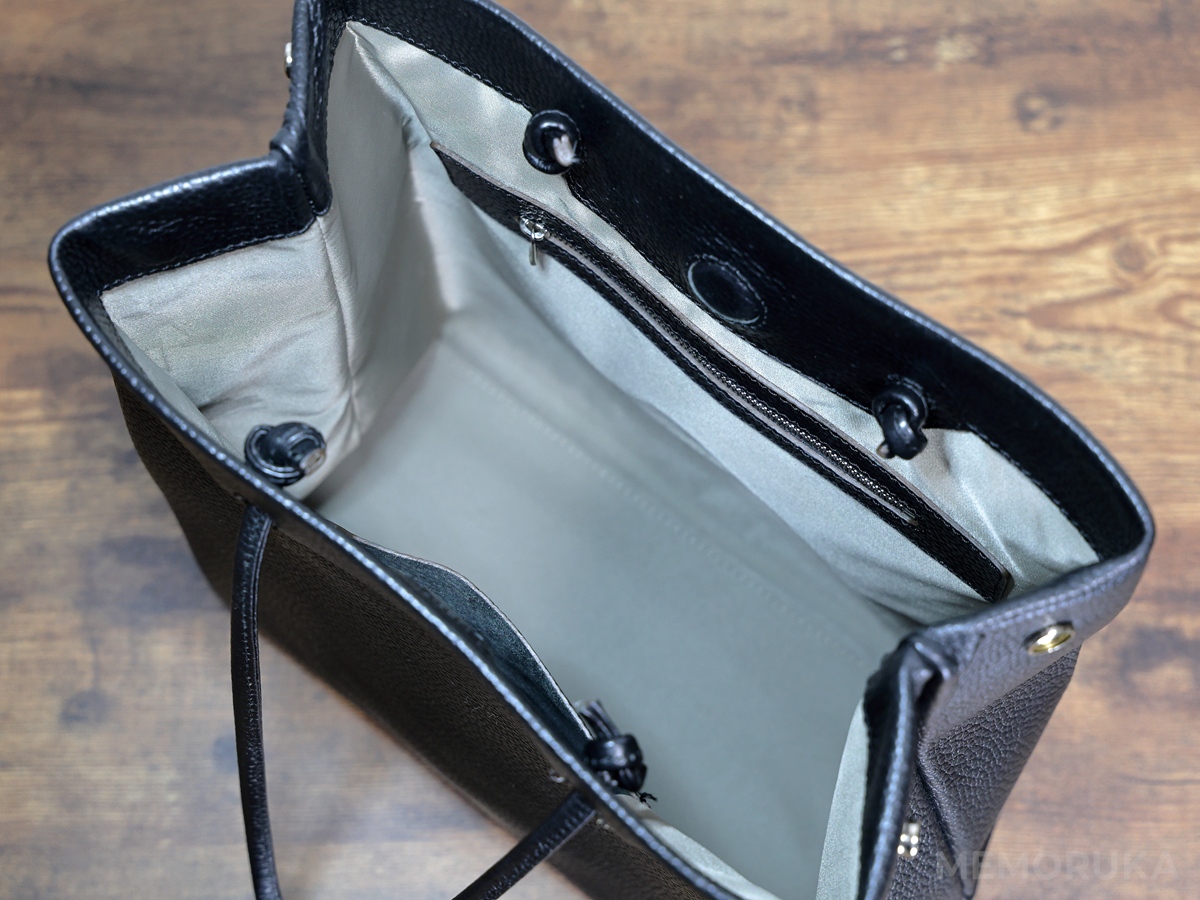 裏地は明るめのグレー系で、中身が非常に見やすい。この手のバッグでは地味ながら、重要なポイントだと思っています。
